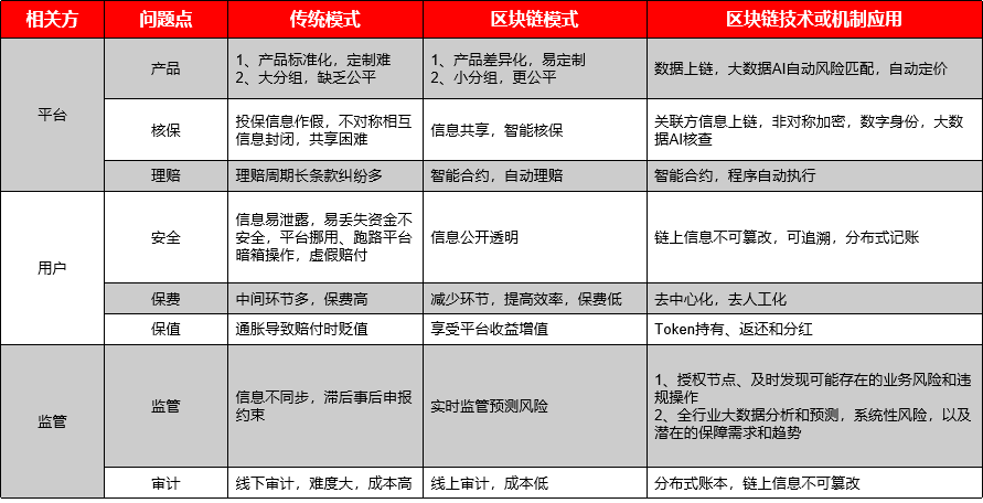 以下對傳統模式和區塊鏈模式從平臺、用戶和監管三個維度來對兩種模式的保險業務進行對比