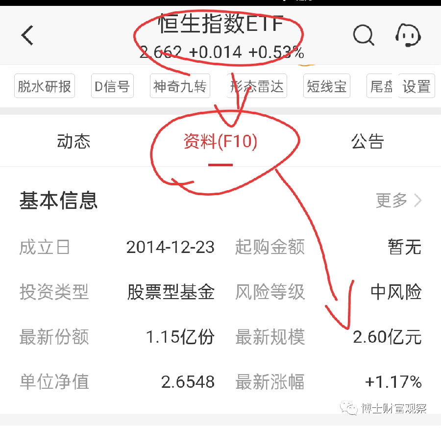 第一,要注意帶框框的ETF字樣,這說明他是一個ETF基金。還有比如其他字樣的,說明是其他種類。本文不做討論,關注他是ETF就好。比如恒生中國、恒生國企,他的名字中沒有ETF,所以只能通過帶框框的ETF標記看出來。