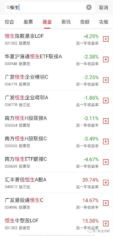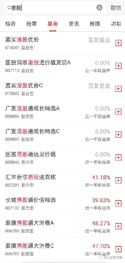 那麼,如何選取港股題材的公募基金呢?方法和上面選擇ETF的一樣,只不過在標籤上,選擇“基金”即可。如下圖: