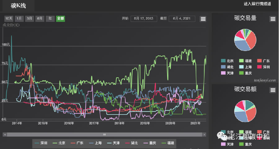 還有就是CCER從2017年3月起就暫停了,現在無論是一類還是三類現貨都比較少,價格都起來了,而且估計還會漲。但一旦CCER重啟,價格可能又會打回原形,目前CCER重開無任何消息,敢不敢買看就看你膽識。 最後推薦幾個看行情的地方。 一是碳交易網http://www.tanpaifang.com可以看八大交易市場的K線圖、交易量和交易額。