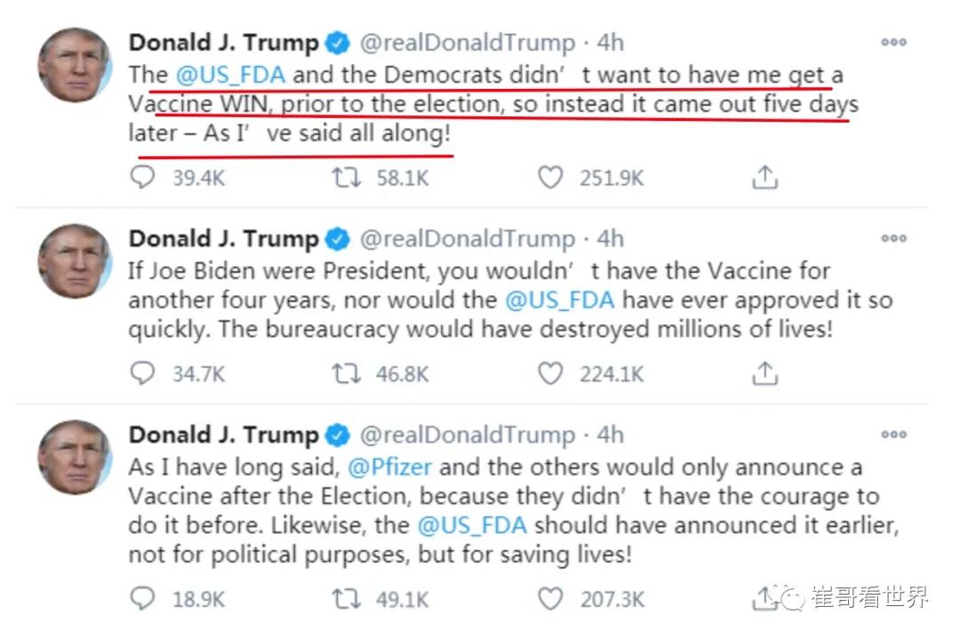 之後,全球股市暴漲,美國總統特朗普也抱怨輝瑞公司沒有在大選之前公佈這個好消息,可見大家都普遍對這個疫苗的效用給予厚望。