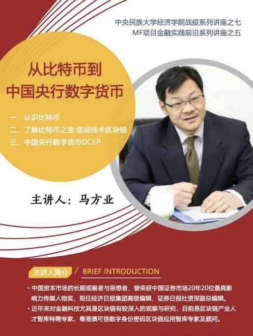 本機構高級研究員馬方業先生日前受到中央民族大學經濟學院邀請,將於2020年6月13日為該校研究生作“從比特幣到中國央行數字貨幣”的學術講座。