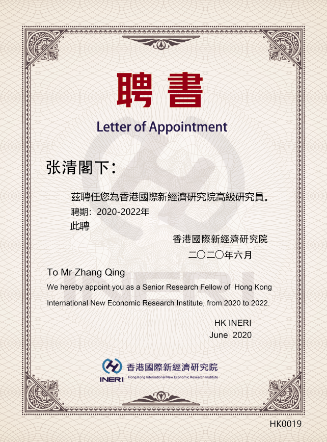 國際新經濟研究院聘請張清為本機構高級研究員。