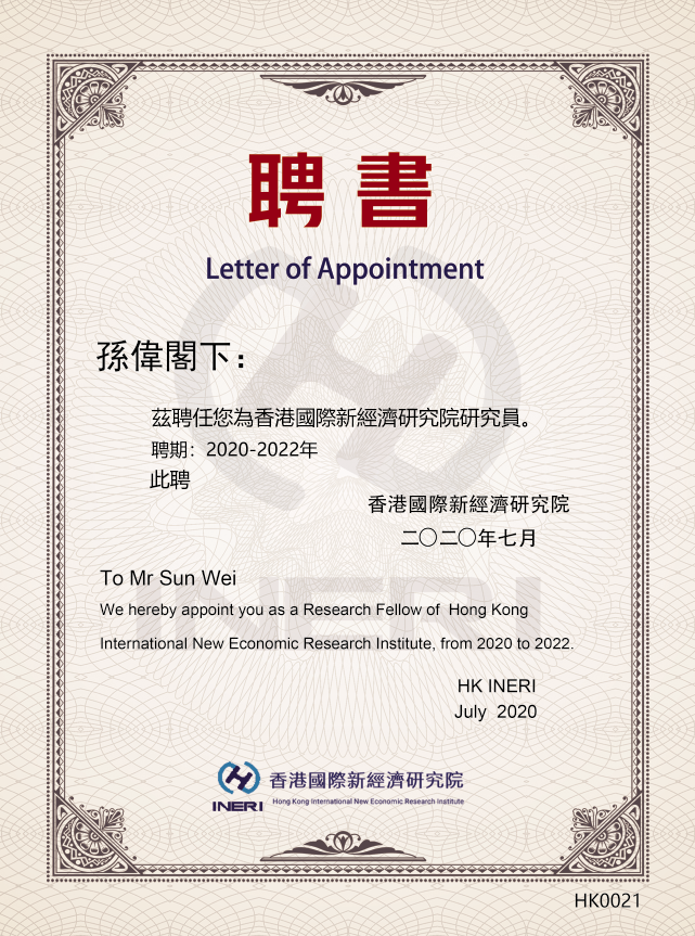 國際新經濟研究院聘請孫偉為本機構研究員。