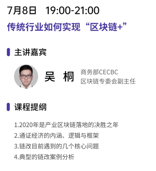 7月8日晚,商務部CECBC區塊鏈專委會副主任、香港國際新經濟高級研究員吳桐博士開講《傳統產業如何實現“區塊鏈+”》,講述了如何通過鏈改重塑社會結構和經濟格局。吳桐博士認為,通證是指可流通的憑證和實物,而其本質是信用和貨幣的加總。信用和貨幣兩種特性越融合,說明發展程度越高。