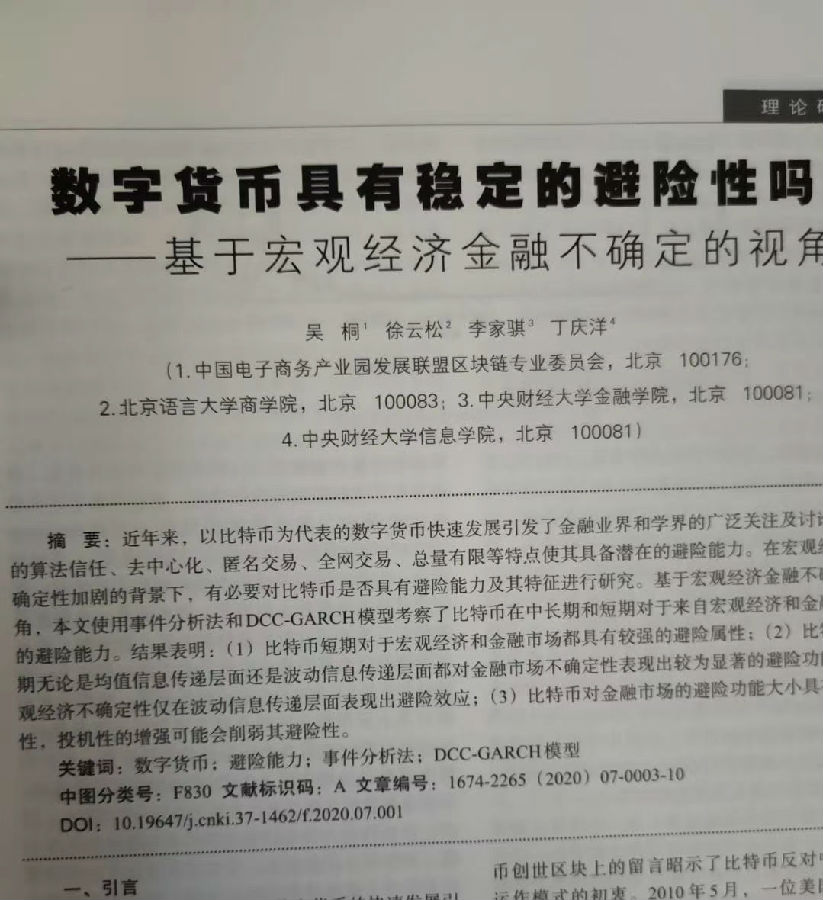 吳桐博士的論文《數字貨幣具有穩定的避險性嗎?》發表於《金融發展研究》(中文核心期刊)