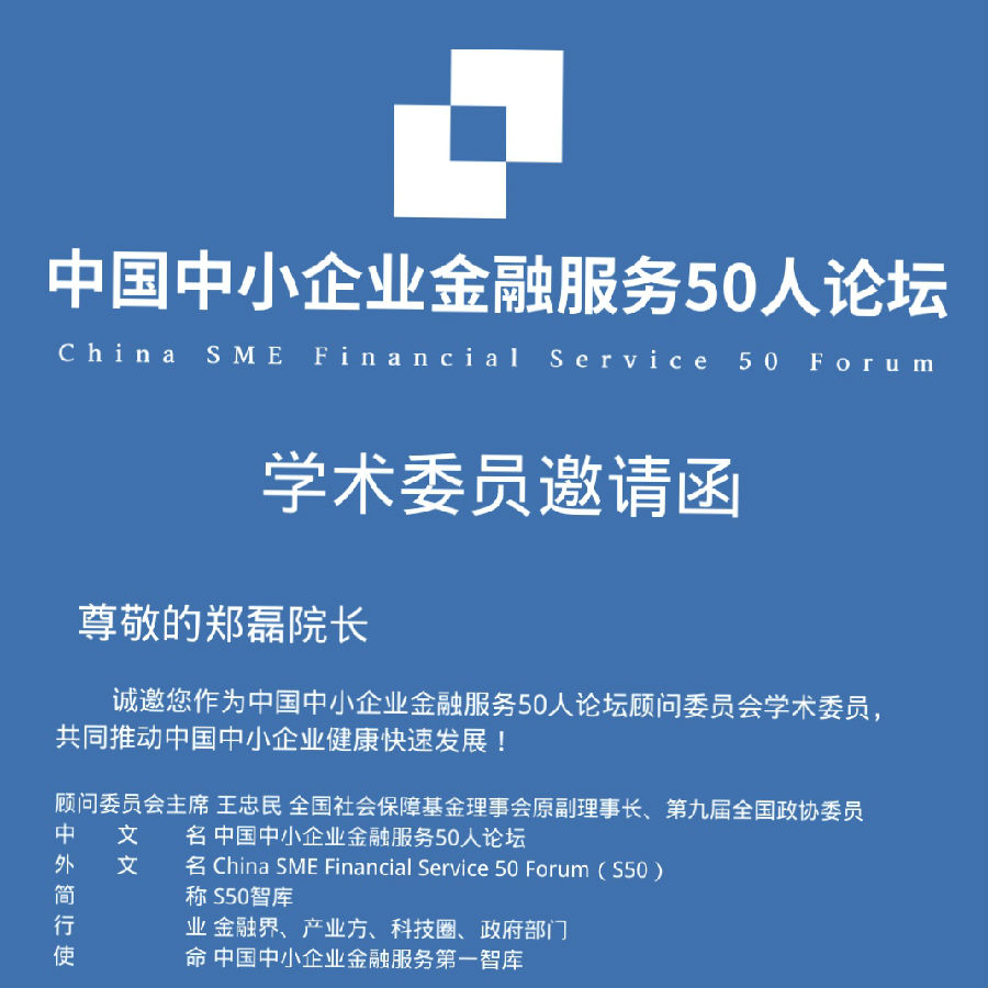 本機構副院長鄭磊受邀參加中國中小企業金融服務50人論壇,擔任顧問委員會學術委員出席論壇。