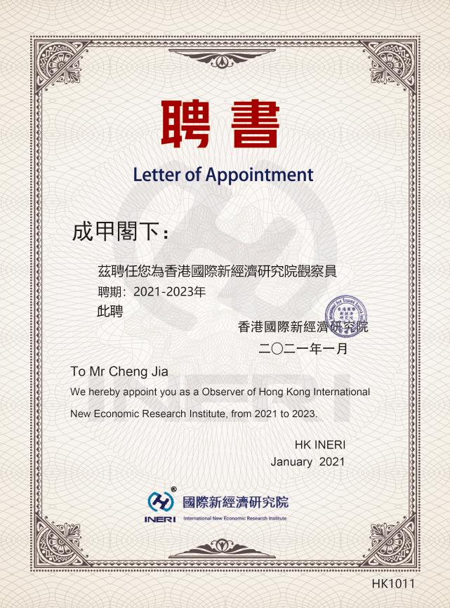國際新經濟研究院誠聘成甲擔任觀察員。