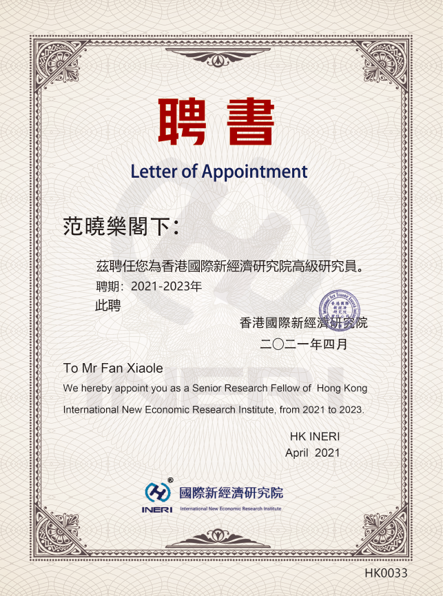 國際新經濟研究院誠聘范曉樂先生為本機構高級研究員。