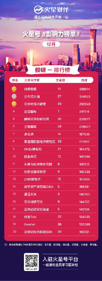 根据区块链权威媒体火星财经的排名,本机构位列火星财经2019年12月投研排行榜第八,以及火星号UP主排行榜第六。