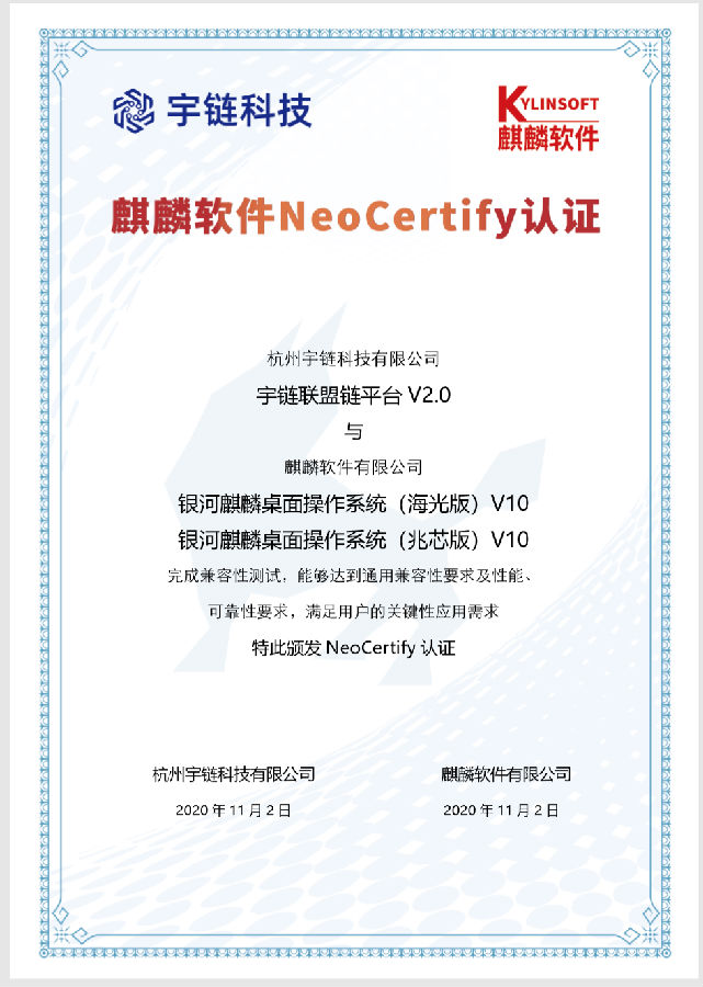 近日,宇鏈科技自主可控產品宇鏈聯盟鏈平臺V2.0與麒麟軟體完成產品相容性互認證。