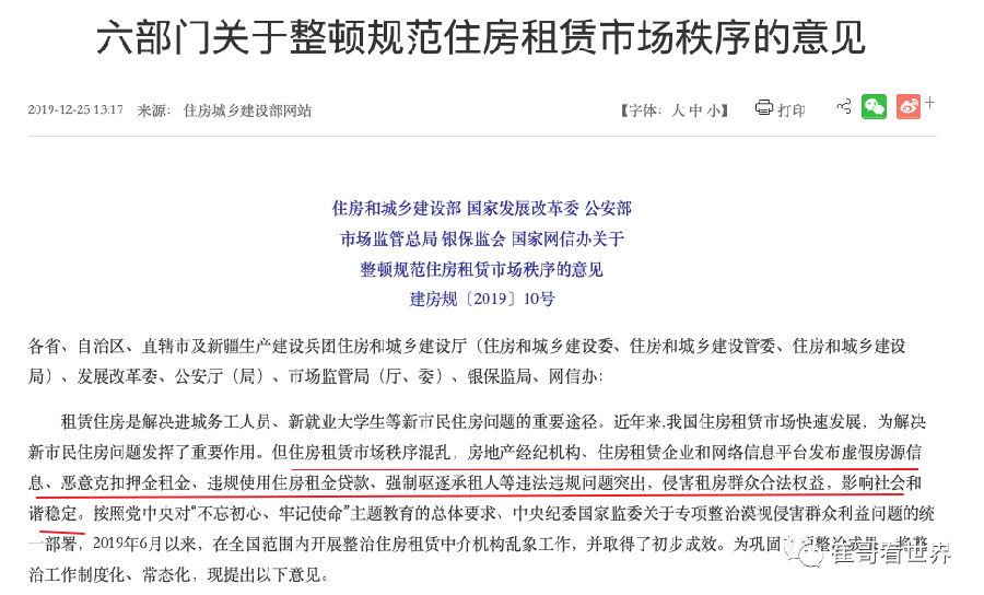 2. 2019年12月底,住房和城鄉建設部、國家發展改革委、公安部、市場監管總局、銀保監會、國家網信辦等6部門印發《關於整頓規範住房租賃市場秩序的意見》(以下簡稱《意見》),其中一條很重要的內容:控制房屋租賃行業“杠杆率”,租金貸收入占比不得超過30%。