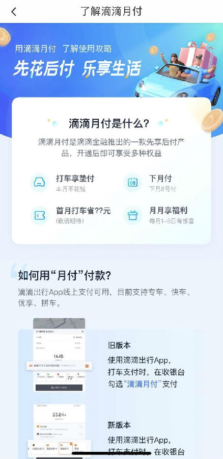 滴滴方面告訴第一財經,滴滴月付產品是滴滴金融近期嘗試性推出的一款先享後付的信用支付產品,用戶開通後,可用於支付滴滴平臺上的出行服務費用。