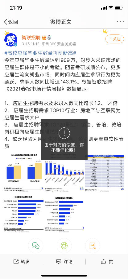 截至發稿,智聯招聘、獵聘和前程無憂等平臺尚未回應。不過在3月15日晚間,智聯招聘和前程無憂的官方微博關閉了評論功能。
