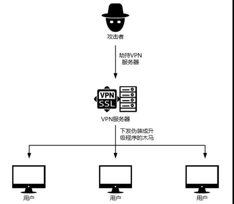 3. 駭客攻擊進入這些版本較舊的VPN伺服器,替換其更新軟體;