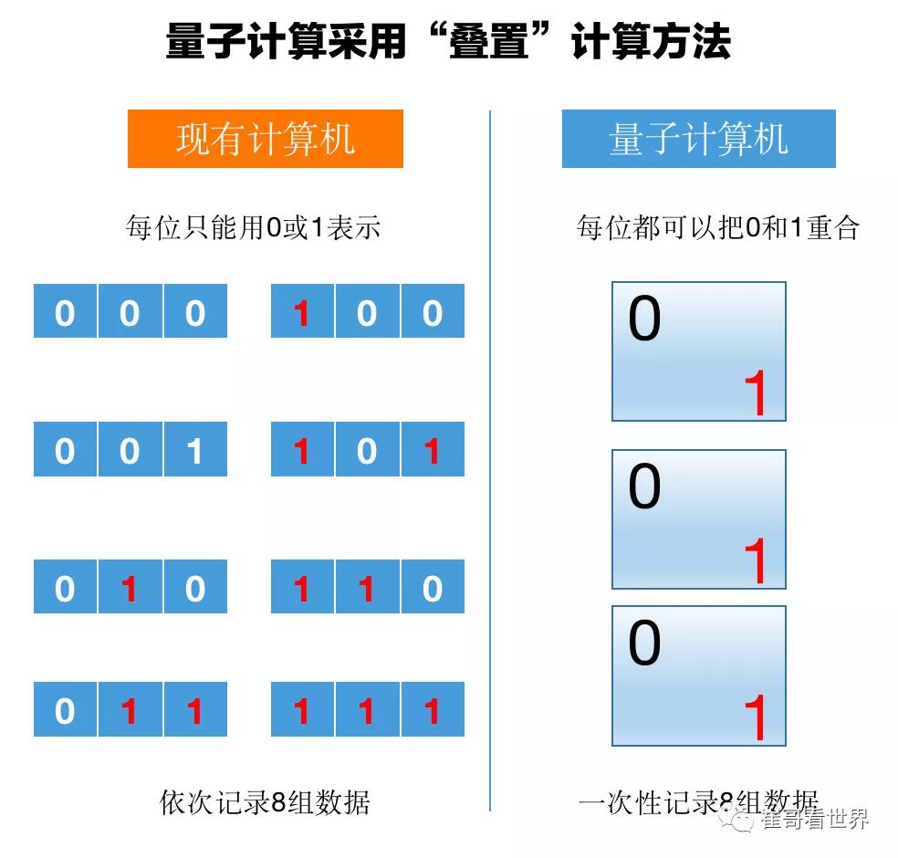 效率提升的關鍵在於,量子計算採用了一種叫做“疊置”的計算方法,如下圖所示:
