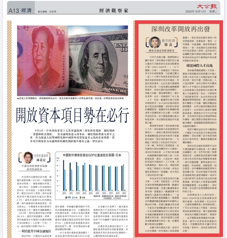 我們不難從這份檔中觀察到中國即將選擇的發展道路—高水準開放型經濟體制。深圳承擔了其中的制度性開放先行者的角色,構建高質量發展體制機制。深圳也是金融科技創新平臺和大灣區數據平臺建設者。為了讓深圳責權利一致,檔特別做了保障措施安排,由國家發改委會同有關方面分批次研究制定授權事項清單,進行批量授權;廣東省要加大行政審批、科技創新、規劃管理、綜合監管、涉外機構和組織管理等方面放權力度,依法依規賦予深圳更多省級經濟社會管理權限。深圳可以提出對現行法律或行政法規的調整建議,經全國人大常委會或國務院授權後實施。在此基礎上,深圳將進一步完善行政管理體制和經濟特區立法。